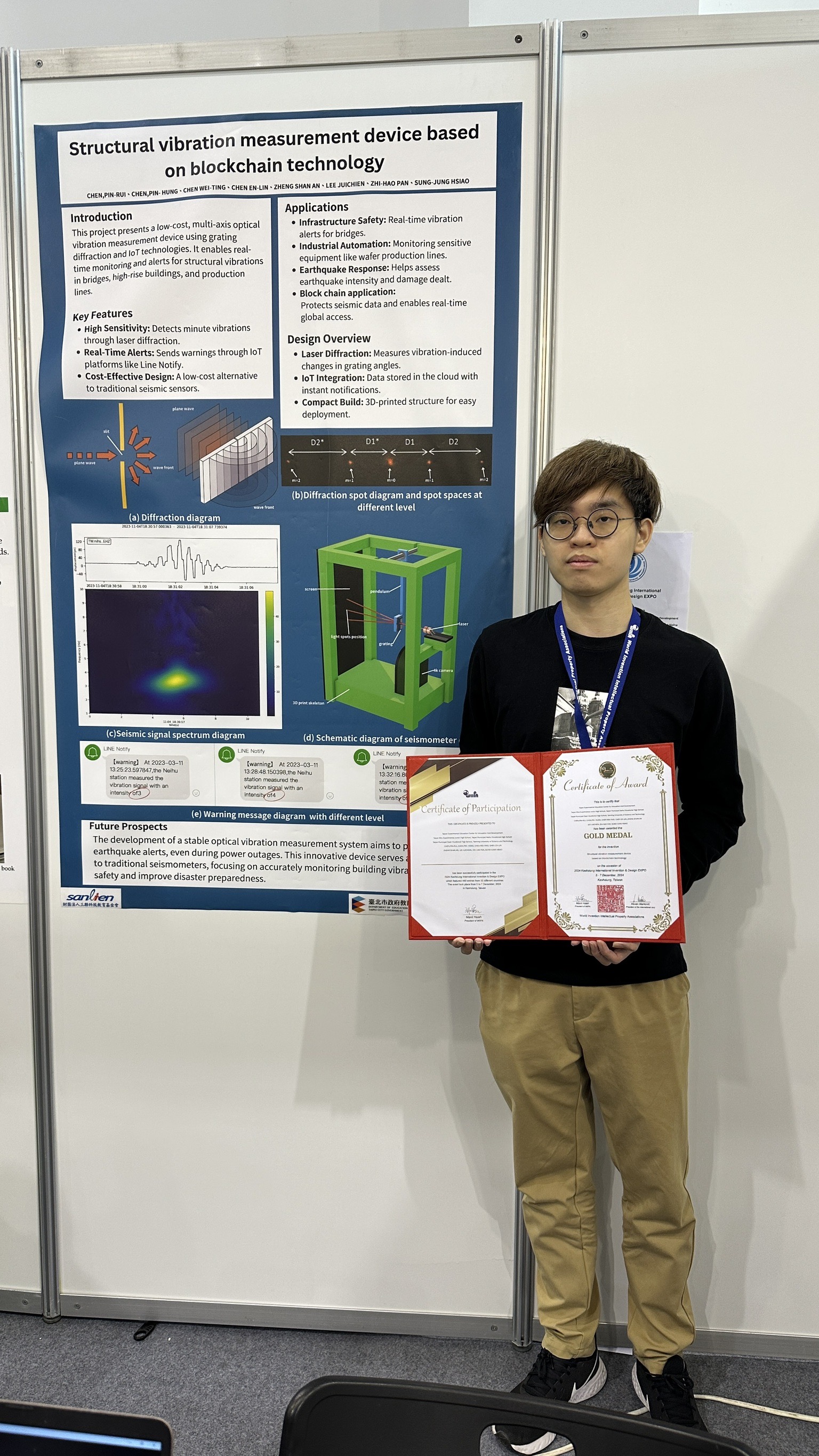 資訊科技系潘志豪同學 榮獲2024第11屆 高雄國際發明暨設計展 榮獲金牌獎,指導老師 蕭宋榮主任。